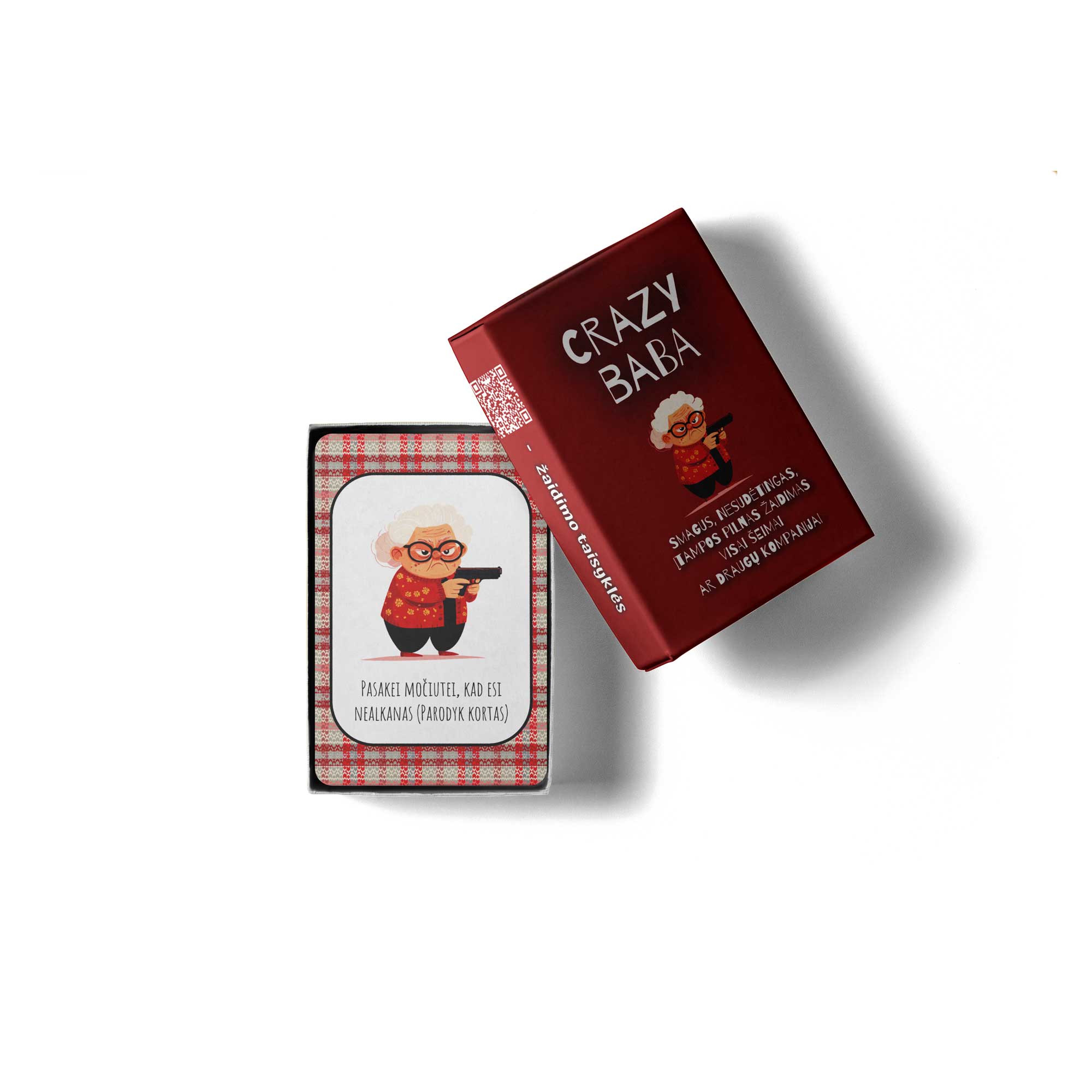 Crazy Baba – linksmas ir nenuspėjamas kortų žaidimas, kuris garantuos daug juoko! Čia viskas paprasta: trauki kortas, atsikratai porų ir stengiesi išvengti nelemtos „Persivalgymo“ kortos. Močiutė gali sumaišyti viską – pakeisti žaidimo kryptį, priversti traukti daugiau kortų ar net parodyti savo kortas kitiems žaidėjams! Žaidimas kupinas netikėtumų ir smagių akimirkų tiek su draugais, tiek su šeima. Išbandyk Crazy Baba ir pažiūrėk, ar sugebėsi pergudrauti kitus!