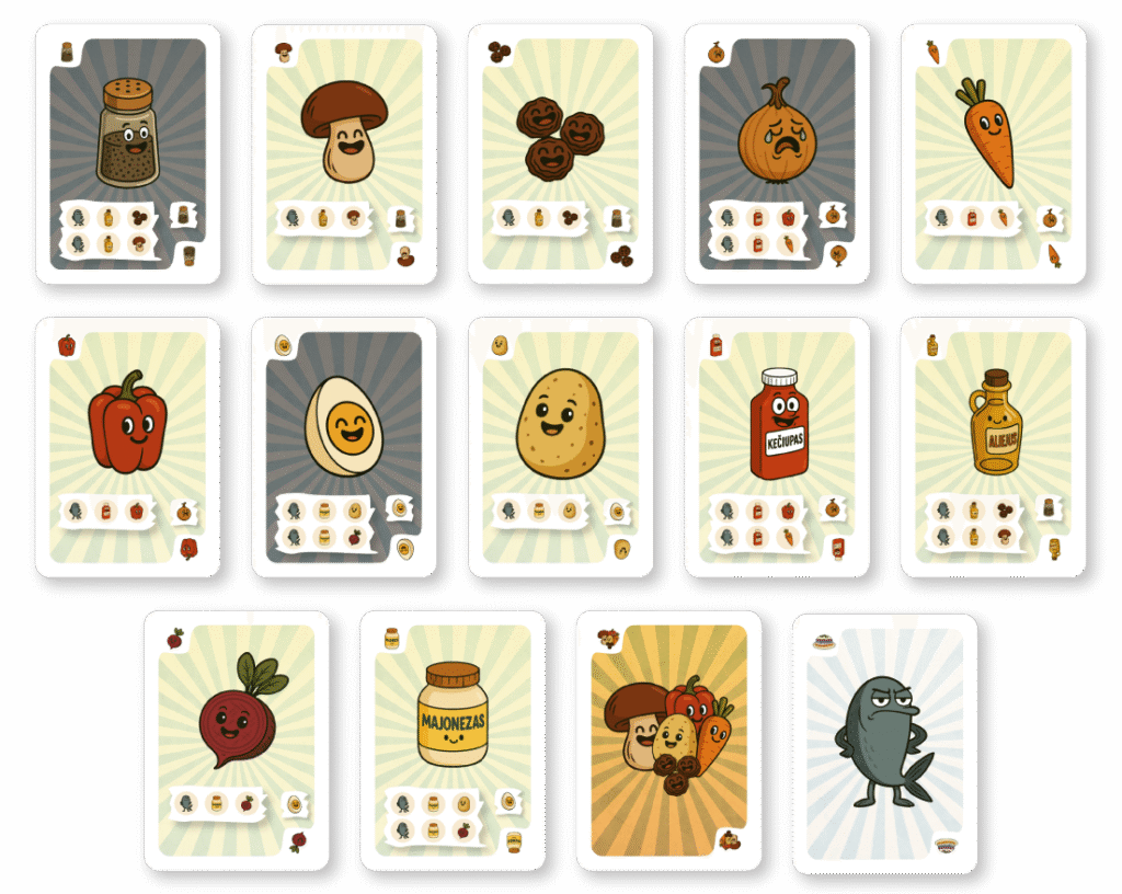- Papildomi ingredientai (18 kortų) – Burokėliai, bulvės, paprika, razinos, morkos, grybai – užbaigia paprastus patiekalus.